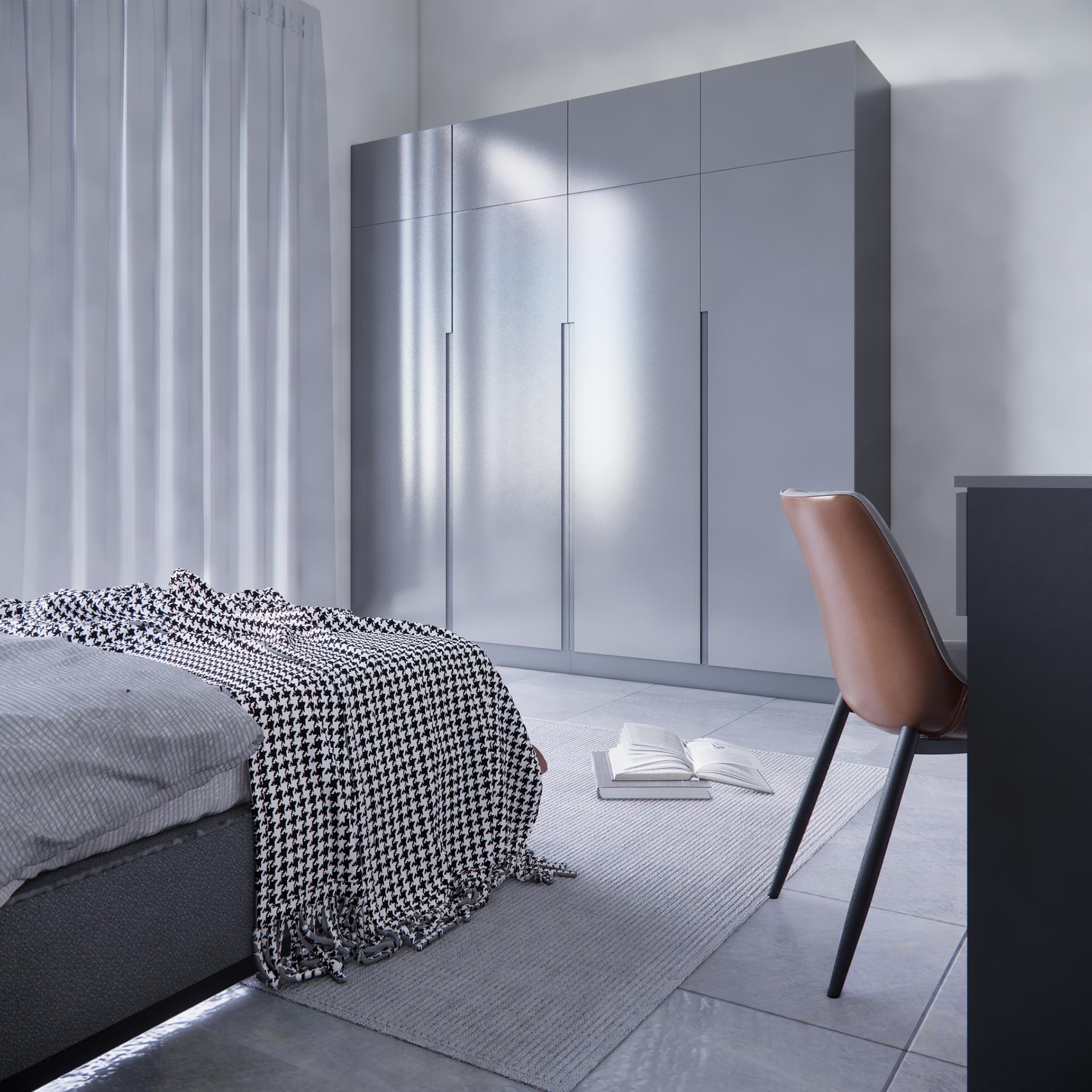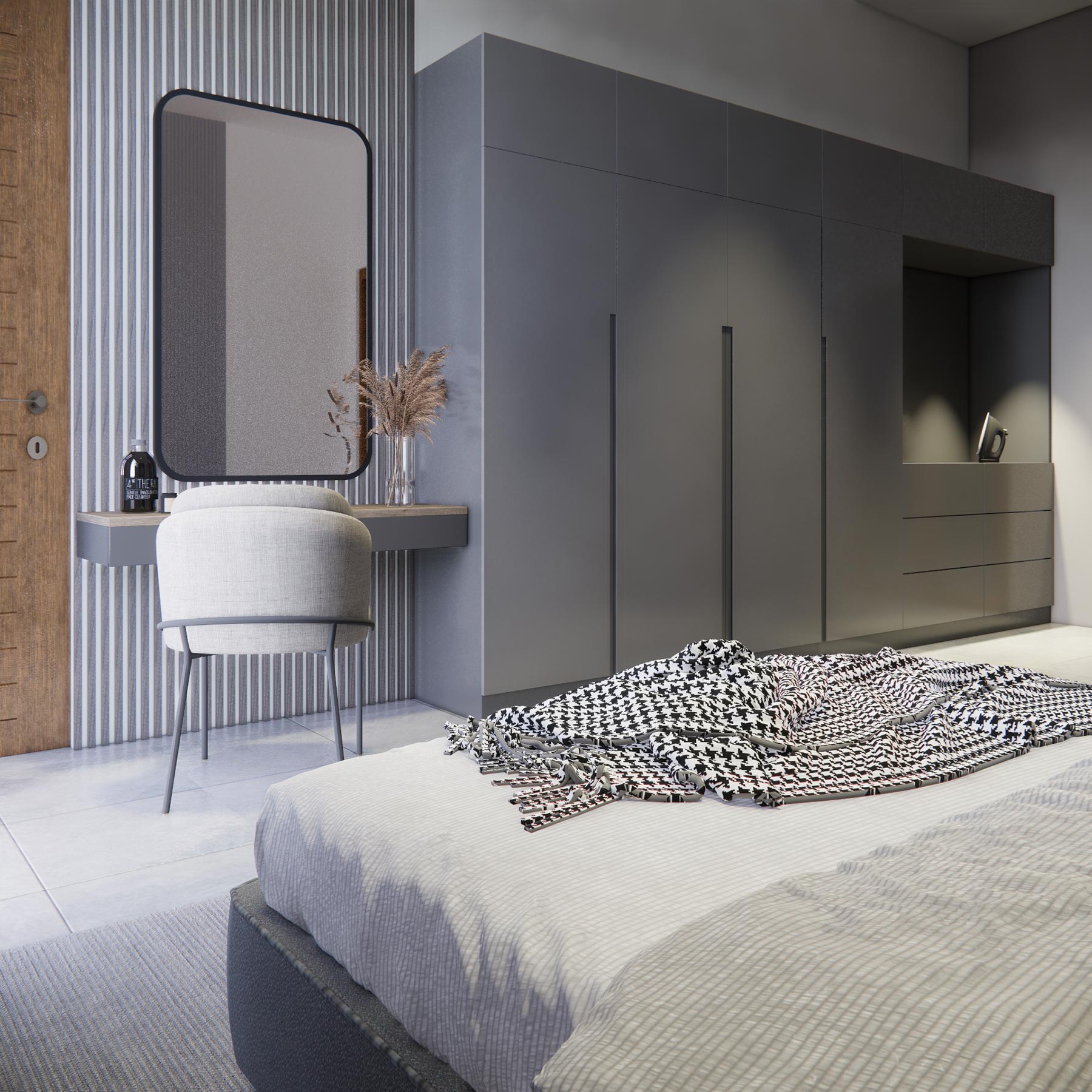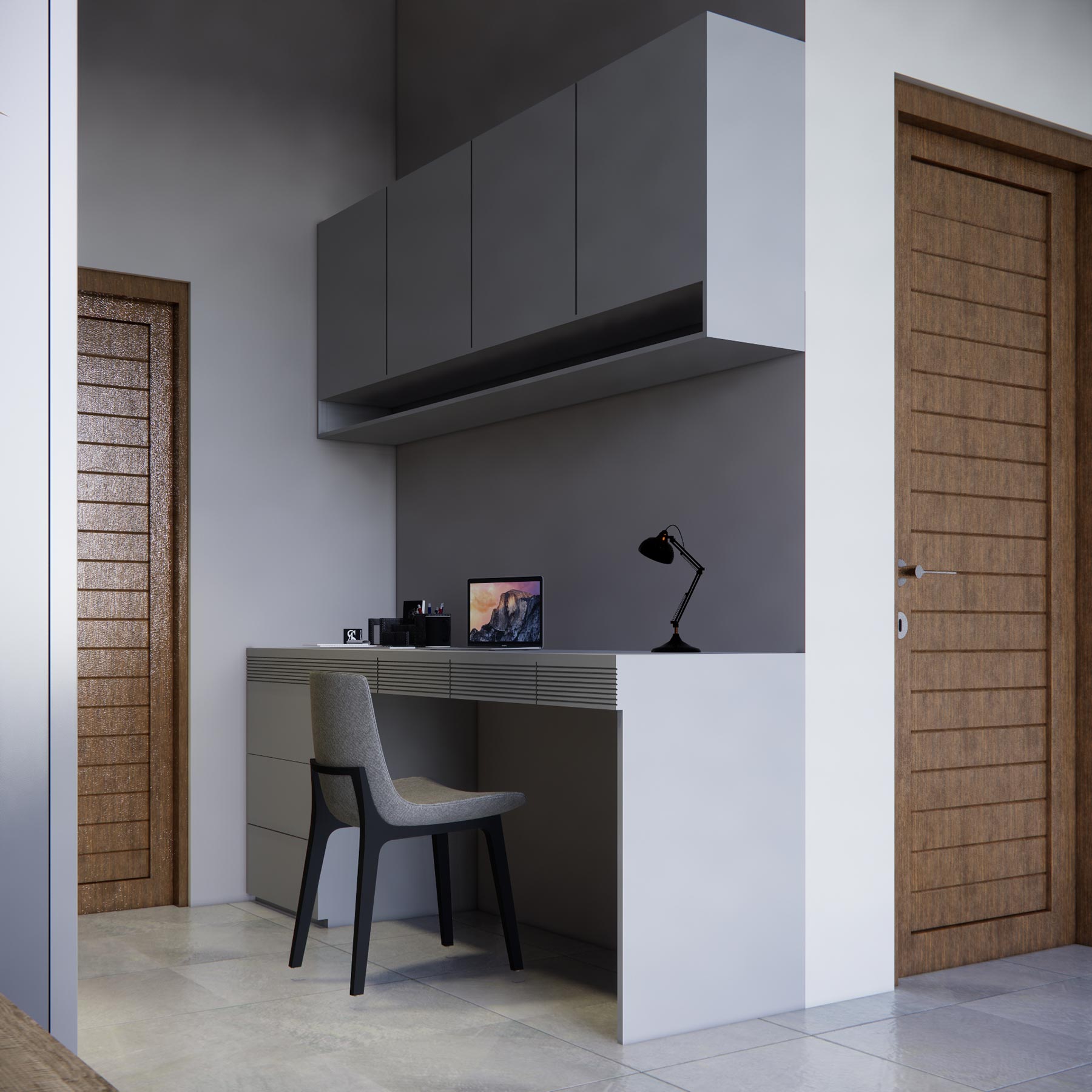 This project features custom study tables, dressing tables, and wardrobes crafted from treated mahogany with a white finish. Designed for the second floor, each piece was made detachable and installed on-site. THE DESIGN TEAM expertly managed column areas, delivering functional, stylish furniture that enhances the room’s aesthetics and usability.