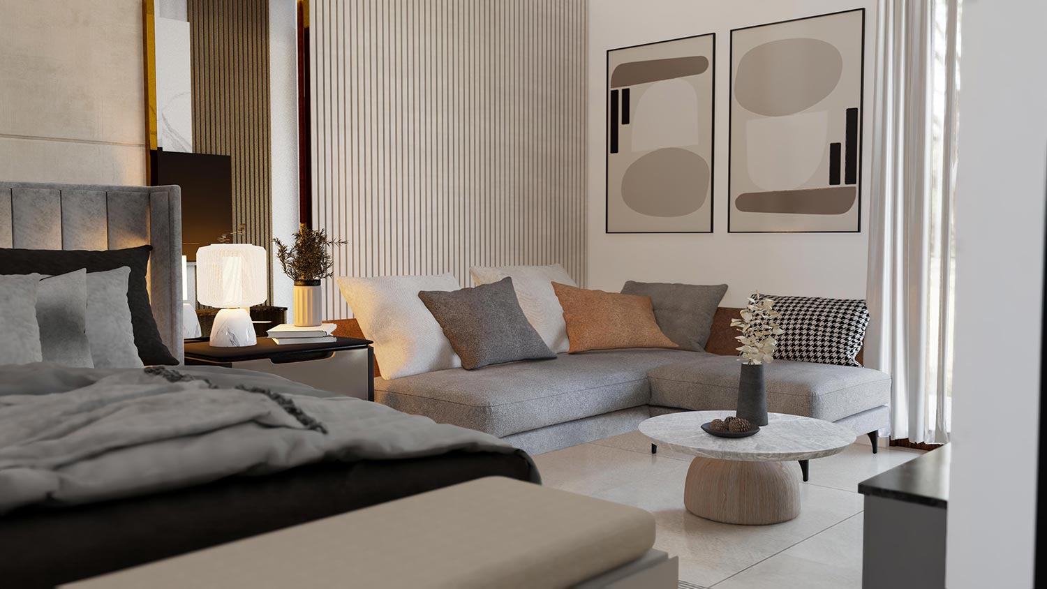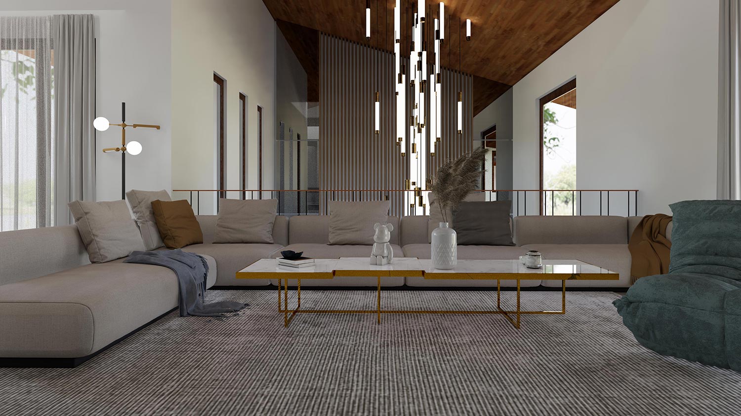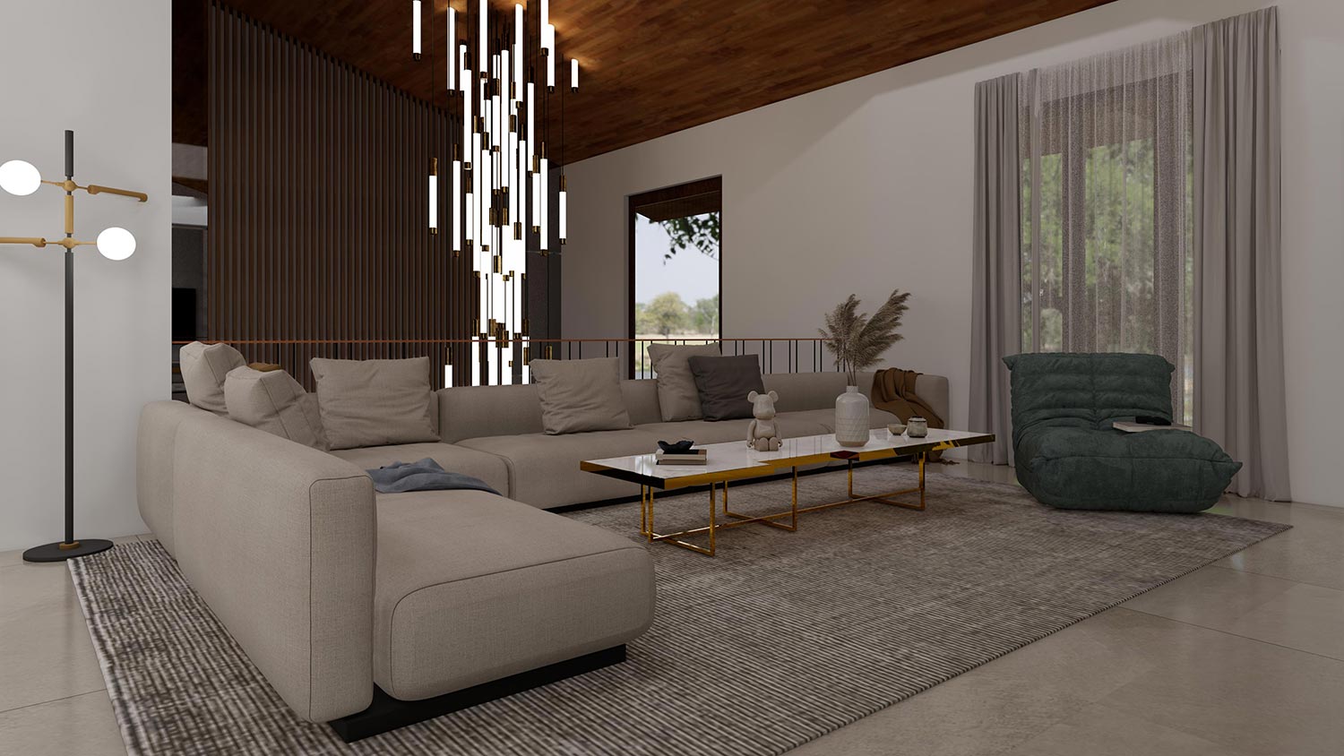 • Living Area : A spacious and inviting space featuring marble accents and steel furniture, perfect for relaxation and entertaining.