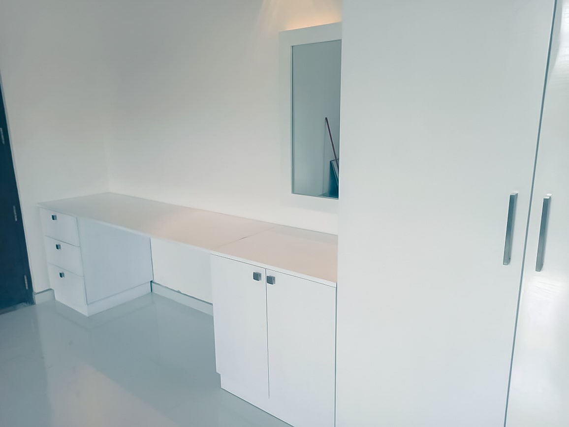 The client approached THE DESIGN TEAM with a clear goal: to create custom furniture for her children’s rooms that would blend seamlessly with the existing design while offering practical solutions for study, storage, and dressing needs. Her key requirements included durable materials suitable for long-term use, a white finish to match the room’s aesthetic, and detachable pieces for easy transportation and installation on the second floor. Our team embraced this challenge, delivering a solution that combined functionality with a polished, modern appearance through meticulous planning and innovative design.